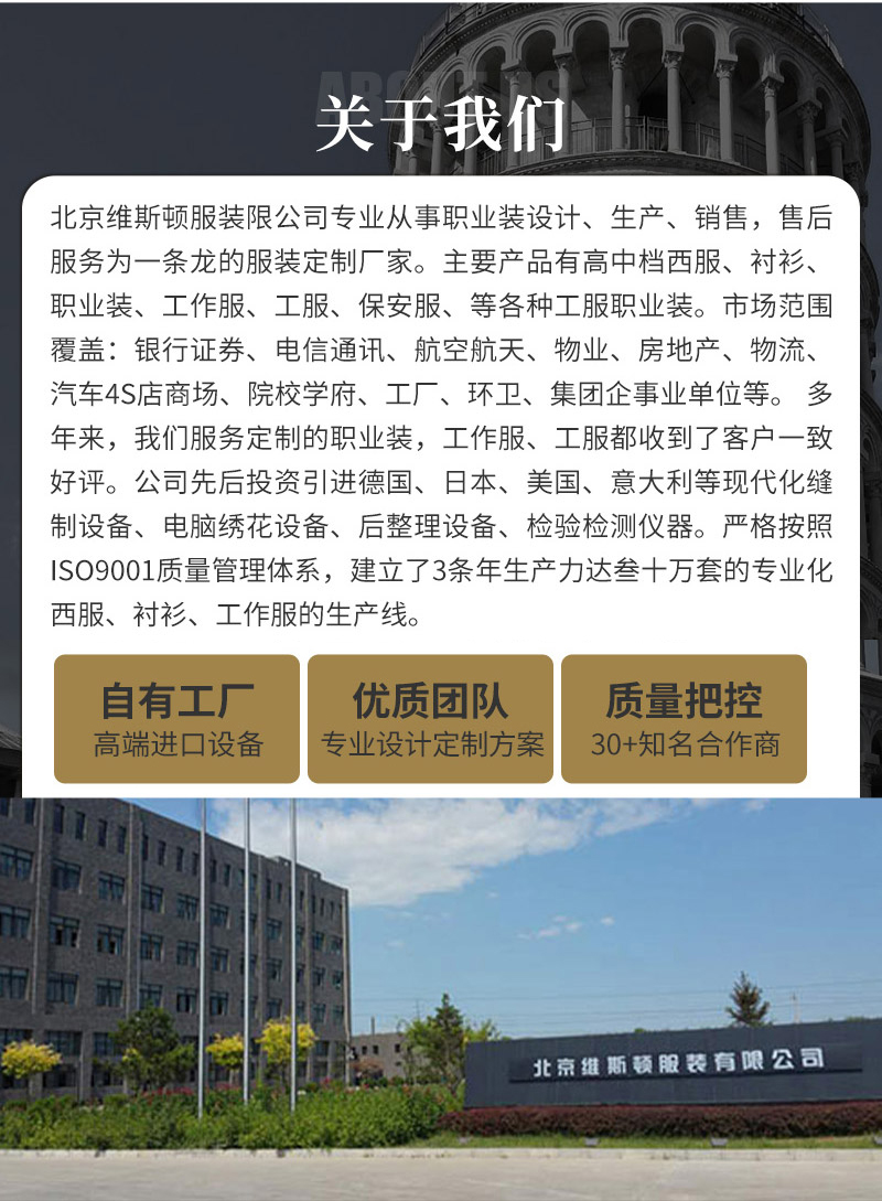 北京維斯頓服裝有限公司專業從事定制西服、職業裝、制服、工作服、工服、工裝、保安服、襯衫、夾克、西裝、商業裝、護士服、校服、保潔服、學生服、工程服、男式西服、女士西服、特體西服等。維斯頓品牌斯蒂維紳