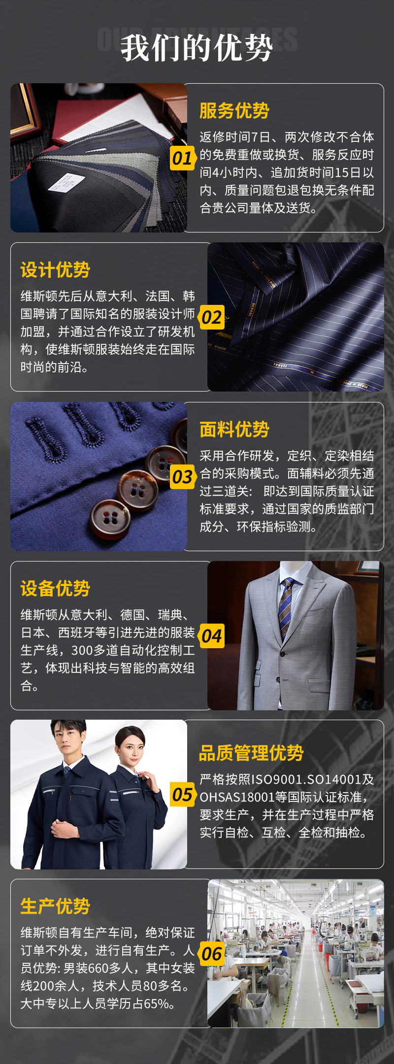 通過服務優勢、設計優勢、面料優勢、設備優勢、品質管理優勢、生產優勢等全方位制作高品質定制服裝,以此來強化對產品、品牌的體驗認知!